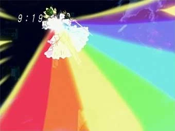 BioLotusmon feuert einen regenbogenfarbigen Energiestrahl aus seinem Stab auf seinen Gegner.