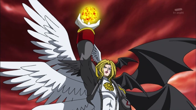 Lucemon digitiert im Kampf gegen KaiserGreymon und MagnaGarurumon zu einem Lucemon Falldown Mode.