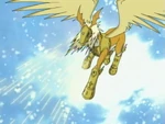 Heiliges Band | Golden Noose | Pegasusmon bildet Energie um seine Hufe und formt dann, zusammen mit einem Nefertimon, ein Band aus heiliger Energie um den Gegner. |