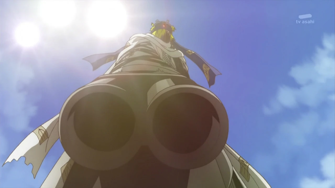 Reapmon ruft ein großes Gewehr herbei und feuert rote Energieentladungen aus diesem auf seinen Gegner.
