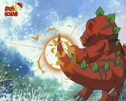 Tyrannomon schlägt seinen Gegner mit seinem Schwanz.