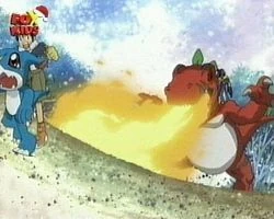 Tyrannomon speiht einen Feuerstrahl auf seinen Gegner.