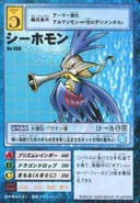 Seahomon es un Digimon Tipo Acuático. Tiene la apariencia de un caballito de mar amarillo, con elegantes estandartes azules y la boca como una trompeta o mas parecida a un altavoz. Su nombre deriva de sea horse.