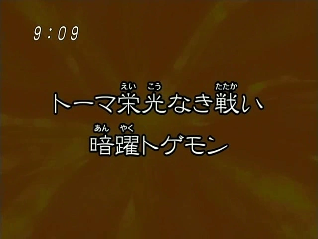 L'importance de l'honneur (トーマ栄光なき戦い 暗躍トゲモン, Tōma Eikounaki Tatakai, Anyaku Togemon) est le 9ème épisode de Digimon Savers.