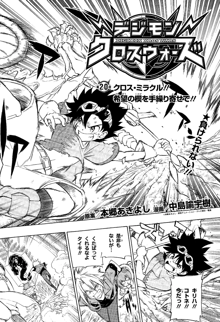 Xros Miracle !! Rassemblons nos espoirs !! (クロス・ミラクル!!希望の楔を手繰り寄せて!!, Kurosu Mirakuru!! Kibou no Kusabi o Taguriyosete!!) est le 20ème chapitre de Digimon Xros Wars.