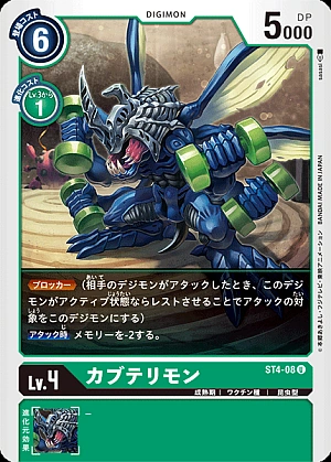 Efekty: <BLOKER> (Gdy wrogi Digimon atakuje podczas gdy ten Digimon jest aktywny, możesz przestawić go do pozycji spoczynkowej i zmienić cel ataku na tego Digimona)
