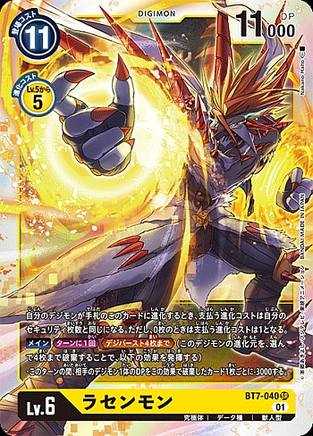 Efekty: Kiedy zagrasz tę kartę ze swojej ręki w celu ewolucji swojego Digimona, koszt ewolucji wyniesie tyle samo, ile masz kart w swojej ochronie. Jednakże, jeśli masz 0 kart w swojej ochronie, koszt ewolucji wyniesie 1.