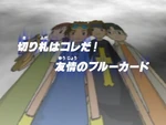Jap. "Kirifuda Hakoreda? Juđou no Burukado" (切り札はこれだ ? 友情のブルーカード - da li je to adut? plava karta prijateljstva).