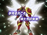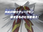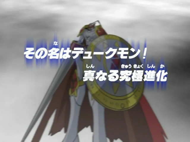Jap. "Sononaha Djukmon! Šinaru Kjukjoku Šinka" (その名はデュークモン!真なる究極進化 - ime je Djukmon sveta mega evolucija).
