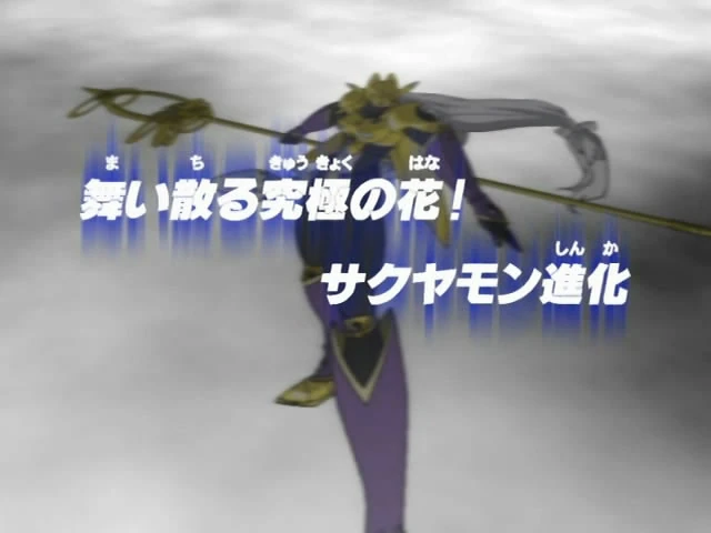 Jap. "Mai Čiru Kjukjoku no Hana! Sakujamon Šinka" (舞い散る究極の花!サクヤモン進化 - ultimativni kovitlajući cvet Sakujamon evoluira).