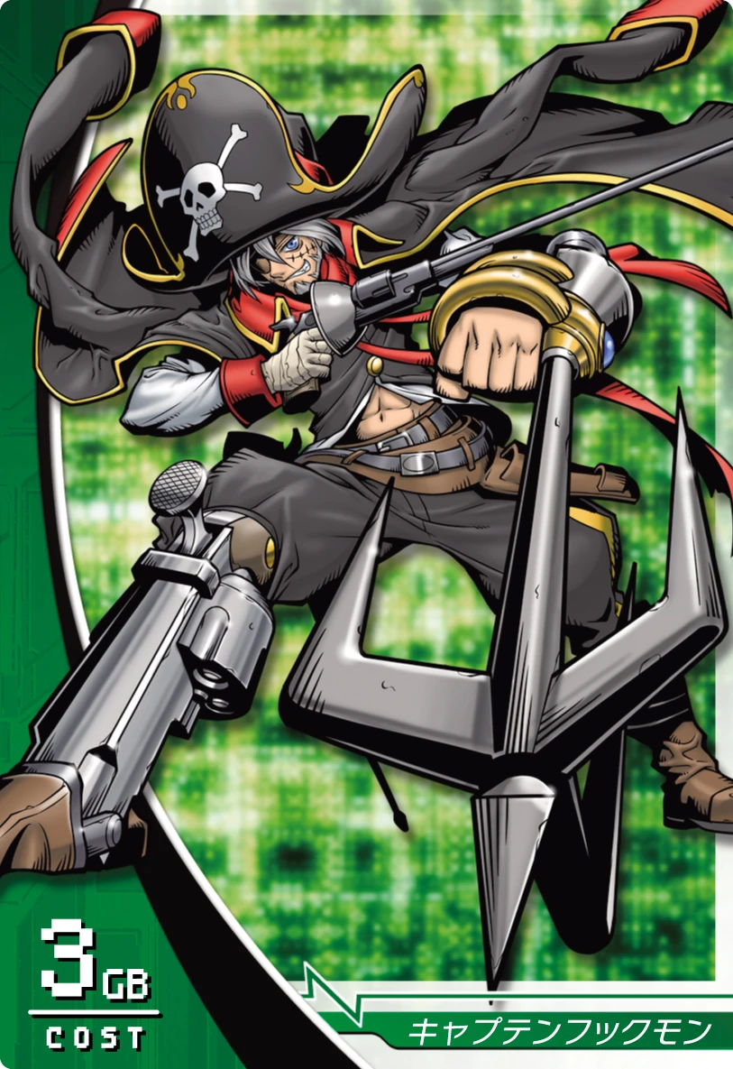 - กัปตันฮุ๊คคุมอน เป็นกัปตันเรือที่กล้าหาญของดิจิมอนที่อาศัยการเป็นผู้นำจากเรือโจรสลัดที่ล่องเรือในโลกดิจิตอล มันยอดเยี่ยมในศิลปะของการอยู่รอด แต่หน้าที่ในการสนับสนุนผู้ใต้บังคับบัญชาหนักหนักกับมันและจะรู้โดยตรงเพียงว่าเป็นเรื่องยากที่เป็น ดังนั้นจึงไม่เพียง แต่ข้ามมหาสมุทรด้วยพฤติกรรมอันสุภาพก่อนที่ฝ่ายตรงข้ามที่อ่อนแอและอื่น ๆ แต่ยังชำนาญในการทำทางผ่านโลก มันไม่ได้โหดร้ายพอที่จะท้าทายหนึ่งในการต่อสู้ที่ไม่สมควร แต่ถ้าท้าทายในการต่อสู้ก็จะได้พบกับศัตรูที่มีอำนาจทั้งหมดของ "Rage Giga Anchor" ติดตั้งไว้ในมือเพื่อเป็นการแสดงออกถึงความหวาดกลัวของ กัปตันฮุ๊คคุมอน ต่อฝ่ายตรงข้ามเพียงอย่างเดียวโดยการจัดขึ้นและเชี่ยวชาญในสไตล์การต่อสู้ที่รุนแรงซึ่งใช้ "Pirate's Punisher" ได้ฟรีซึ่งมีฟังก์ชันการโจมตีและกระสุนปืนอย่างสม่ำเสมอ "Leg Revolver" พอดีกับขาขวาเป็นเทคนิคที่เหมาะสำหรับการโจมตีด้วยความประหลาดใจ แต่กัปตันฮุ๊คคุมอนเป็นสุภาพบุรุษที่ใช้มันในการปิดฉากการเตือน