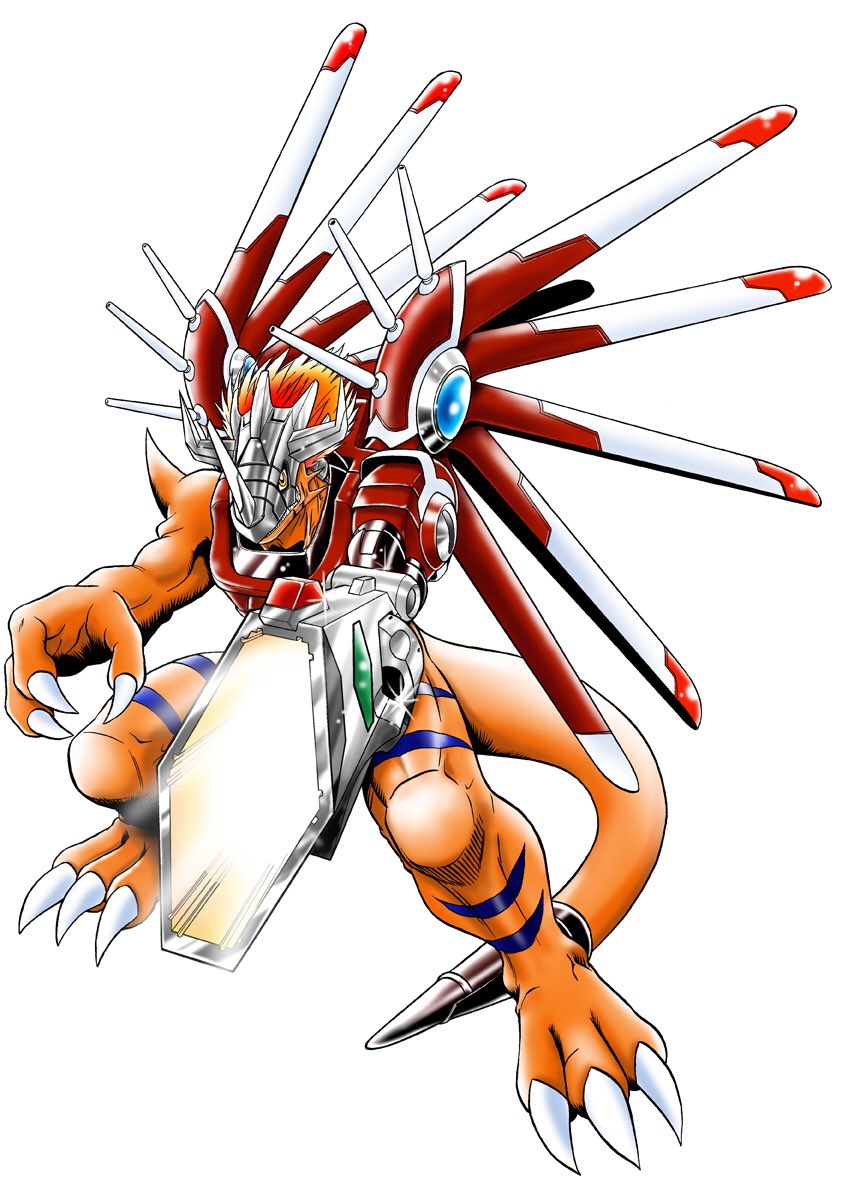 Agumon digivolves to this form when facing Shou Kahara's Crowmon, empowered by Tsurugi's Digisoul of Light. RizeGreymon beats back Crowmon, destroying the Black Digicore in Shou's heart. Following this, he and MachGaogamon head for System World, where he takes out a fleet of BladeKuwagamon by himself before using Tsurugi's Digisoul to punch through the Firewall.