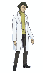 Kurata has black hair and wears glasses, a white lab coat over an olive green undercoat, and dark grey pants.