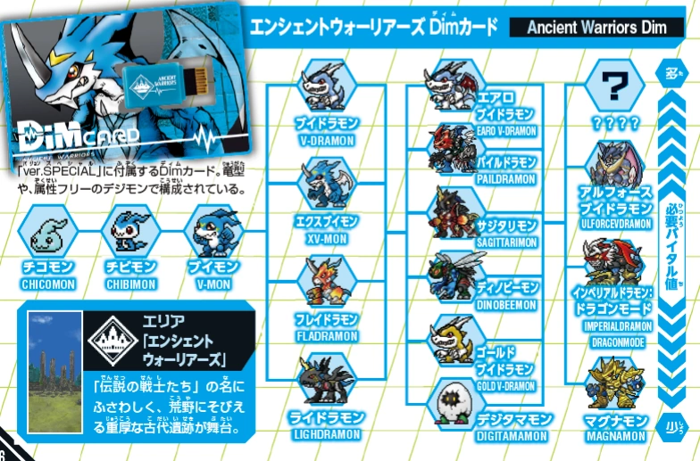 Ancient Warriors is the DIM Card for the Vital Bracelet Digital Monster, released in March 2021. The card is focused on Veemon and its digivolution tree.
