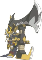 Apollomon Darkness Mode is the DigiFuse of Apollomon Whispered and Axemon. Axemon becomes a gigantic axe that Whispered wields, a pair of spiked blades for his shoulder pads and a visor for his head that acts like a crown. The Battle of The Young Generals