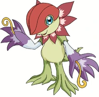 When Tai and T.K. went to Paris, they met a Floramon whose partner was the French DigiDestined, Catherine. Just like their human partners Agumon and Patamon have a crush on Floramon. She and Catherine were captured by Giromon and held captive by the three Mamemon brothers. But Catherine and Floramon were rescued by Tai, T.K., and T.K.'s grandfather. Floramon then digivolved to Kiwimon to help MetalGreymon and MagnaAngemon beat the villains and send them to the Digital World. Floramon later showed up during the final battle against MaloMyotismon.