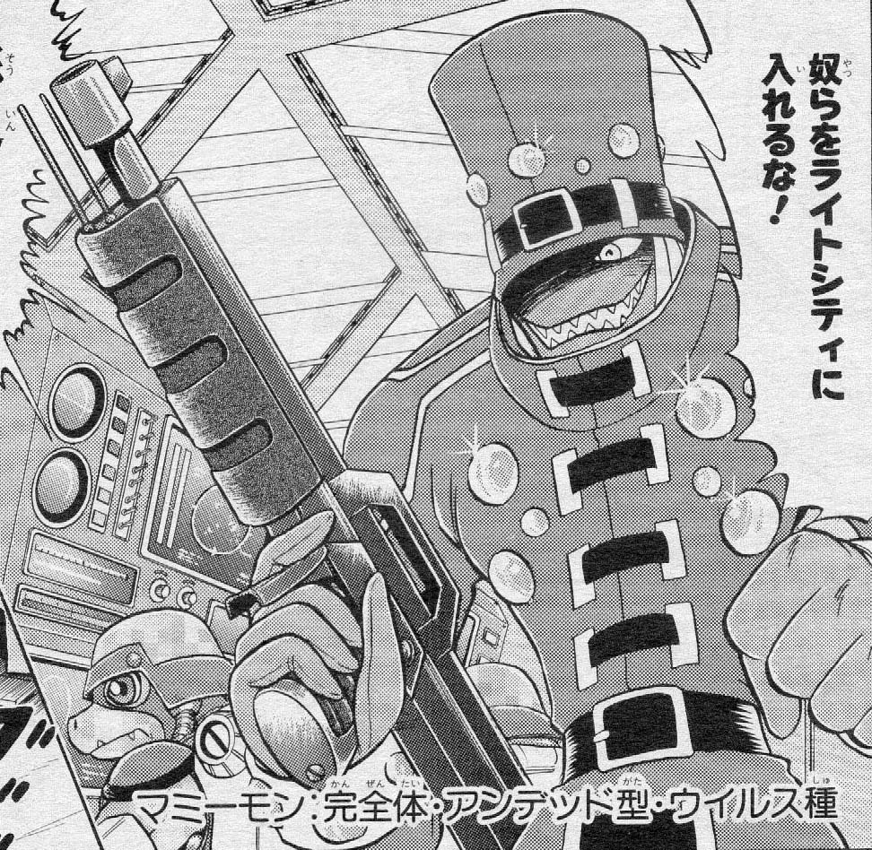 Mummymon is a high-level Commandment who rides on a Battle Armament Trailmon. He first encounters the group outside of Light City, but GeoGreymon heavily damages the Trailmon he is on and slows him. He then reappears at the final stretch, killing Trailmon (C-89 Model) and igniting Yuu's Dark Digisoul. He is then killed by BlackGaogamon.