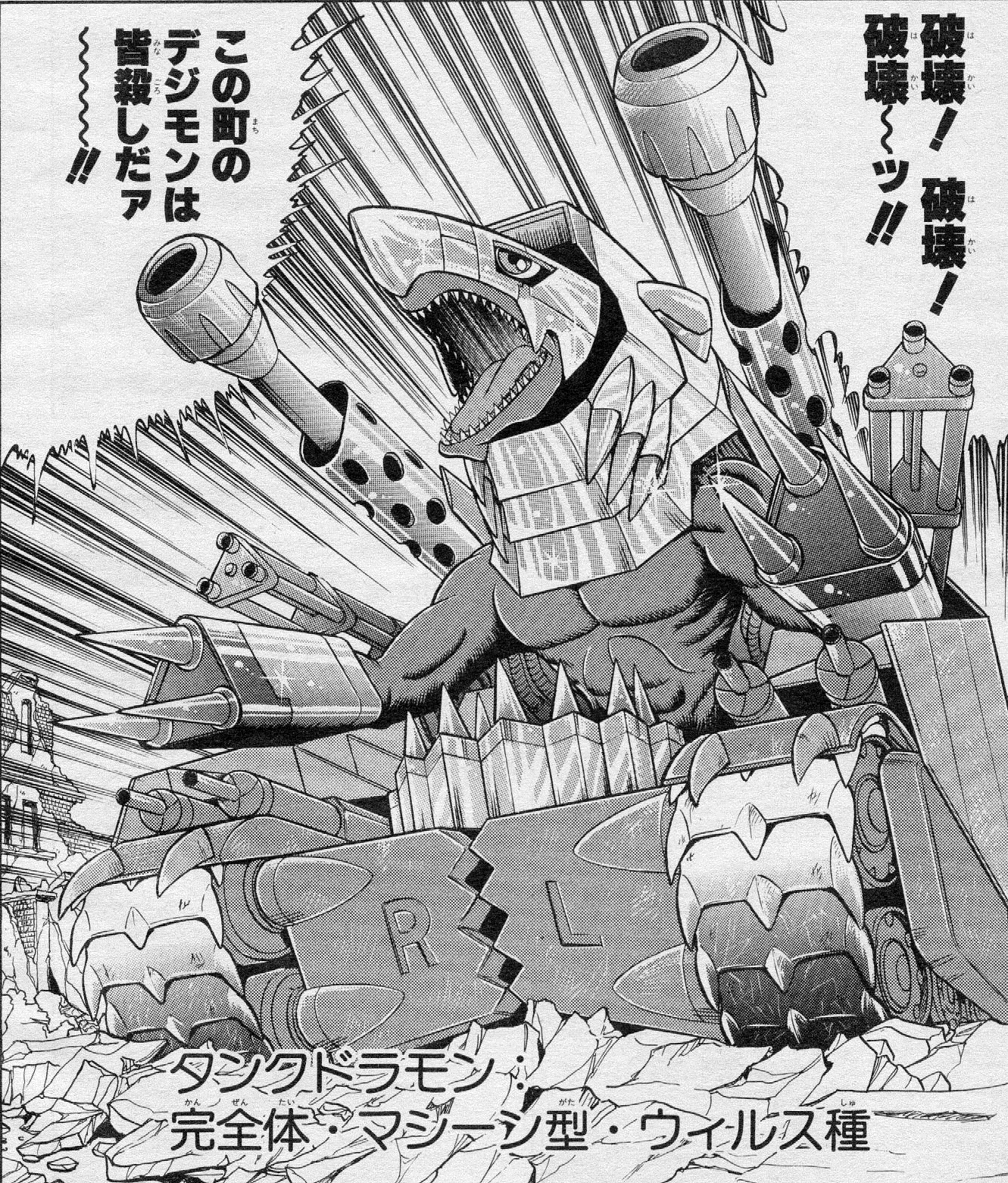 Tankdramon received orders from Barbamon to attack Middle Town. During the attack, he shoots his "Blast Gatling" at all the Digimon who were hiding. When ordered to stop by Tsurugi Tatsuno, he is surprised to see a human, and tells the boy to not talk to him about Digital World issues, and comments on his orders. When Tsurugi questions his orders, Tankdramon claims Barbamon's words are never wrong and proceeds to kill a Bakemon, a Wormmon, a Numemon, and a Pagumon with his "Blast Gatling", which angers Tsurugi. As Agumon's attack is deflected by his armor, Tankdramon fires his "Striver Cannon". After Agumon digivolves to GeoGreymon, the first Tankdramon ever meets, he is able to grab the "Striver Cannon"'s mini-nuke and throw it back at the Machine, which is still not enough. When GeoGreymon aims for Tankdramon's top, the Machine tries to shoot him, but is stopped by Gaomon's "Double Backhand", and, finally, slashed in half by GeoGreymon's "Horn Impulse". Yū and Gaomon!.