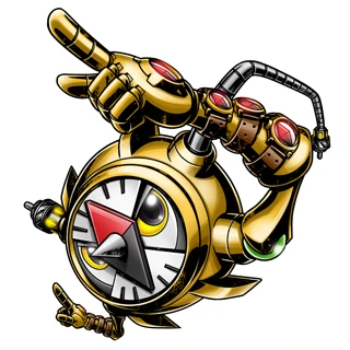 Compassmon is a gold, handheld compass with arms. Its arms also have wrist-worn compasses. Like most Appmon, it has two cables to allow Applink though they're on the top of its head.