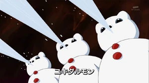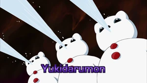 - In the American dub, the analyzers for AncientVolcanomon and the Frigimon are listed as "Volcanomon" and "Yukidarumon", though in later episodes they are named as "AncientVolcanomon" and "Frigimon" in dialogue.
