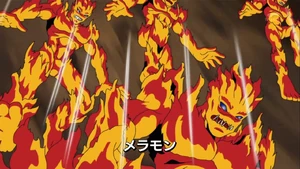 After departing from the Island Zone, the Fusion Fighters arrive in the Magma Zone. Thrown off balance by the sulfur, they find a hot spring and decide to relax. Their break is ruined when SkullMeramon and BlueMeramon as well as a legion of RedMeramons arrive. As a fight breaks out, with the Fusion Fighters losing, Cutemon arrives and protects Angie. SkullMeramon attacks Cutemon, but Mikey protects him with his body. Dorulumon intervenes, and he and BlueMeramon recognize each other before SkullMeramon calls a retreat. While Cutemon heals Mikey, who once more attempts to convince Dorulumon to join their team, Angie asks what they're doing traveling so far. Cutemon explains he was separated from his parents when the Bagra Army attacked his village. He then set off to find them, only to be harassed by a gang of Goblimon who Dorulumon dispatched. Though reluctant at first, Dorulumon allowed Cutemon to accompany him after hearing his story. Despite Dorulumon's insistence on travelling alone, Mikey then proceeds to follow him and Cutemon further into the Magma Zone.