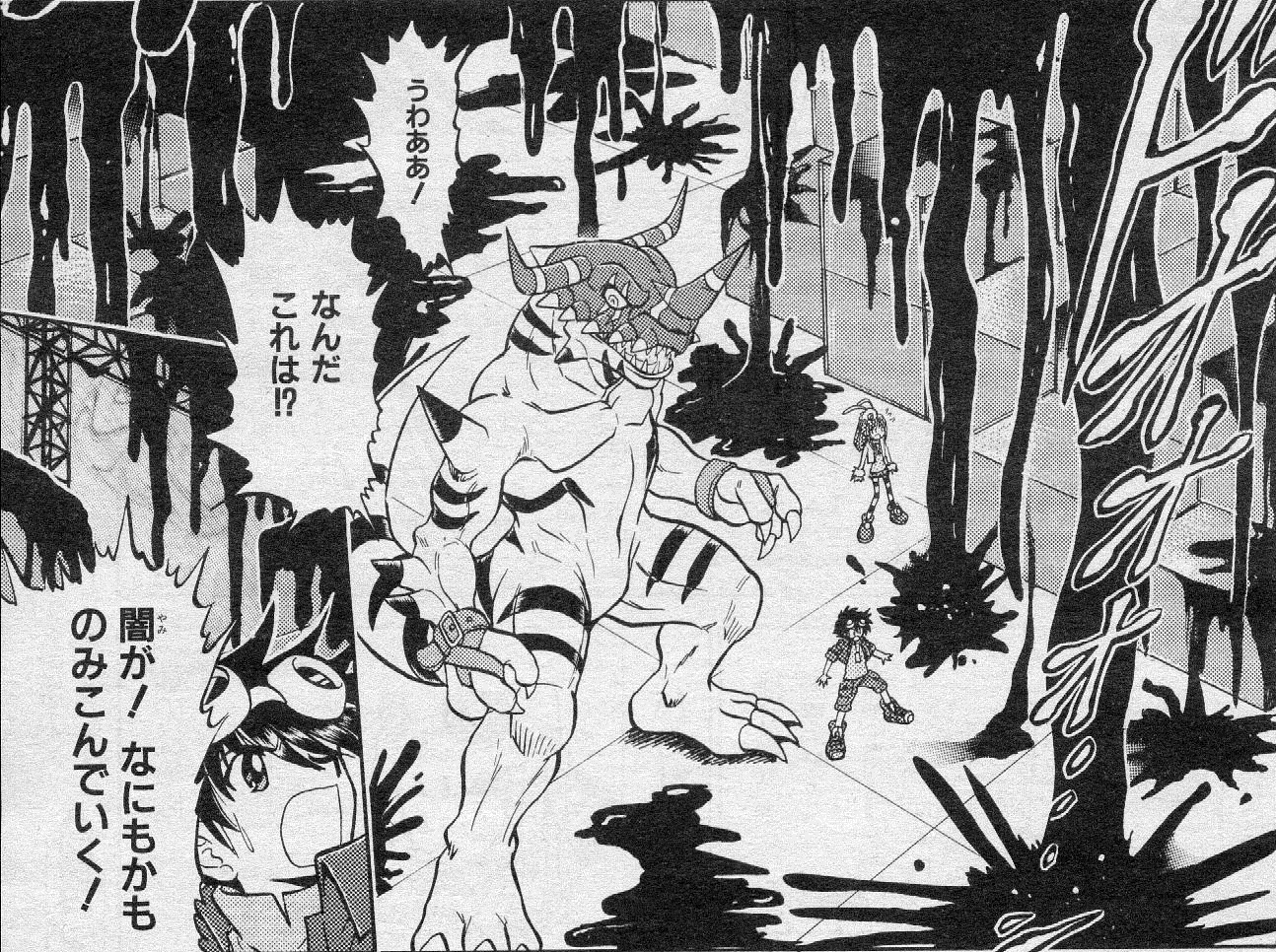 The Dark Area is the Digital World's hell, and once one falls in, they can't come back alive. "Haguro" (羽黒? lit. "Feather-black") is one of its districts and can be summoned by Crowmon. Anything that touches Haguro's darkness, even attacks, is sucked in to the Dark Area. When Sho and Crowmon confront Tsurugi, GeoGreymon, Ami, and Pichimon in Light City's underground warehouse, Crowmon uses his "Haguro" attack, which is immediately detected by the Andromon's computers. GeoGreymon attempts to attack Crowmon with "Mega Flame", but the attack is sucked by the Haguro's darkness. Eventually, GeoGreymon starts being sucked to the Dark Area. Although GeoGreymon tells Tsurugi to stay away, the boy refuses to let GeoGreymon fall into the Dark Area alone and jumps with him, both being completely sucked by the jet-black abyss. GeoGreymon then digivolves to RizeGreymon and emits a light that breaks Haguro, allowing both to come out. Dark Area!