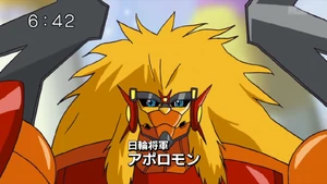 Ewan Amano and Damemon have been watching the entire time and greet a Digimon with the same silhouette as Apollomon, who has just killed Marusumon. Meanwhile, the others attack Apollomon, but Mikey and Shoutmon X4 stand against them, with Shoutmon having been convinced by Apollomon's nobility. When MetalGreymon fires on Apollomon, Mikey attempts to block the attack. Apollomon, in turn, protects Mikey. Doing so reveals the scars on his formerly bandaged right arm, where Apollomon reveals that he punishes himself by refusing to heal his own battle wounds as long as he has to harm the Digimon he rules over. The reveal mollifies Nene and Christopher, who agree to fight alongside him, though they don't trust him.