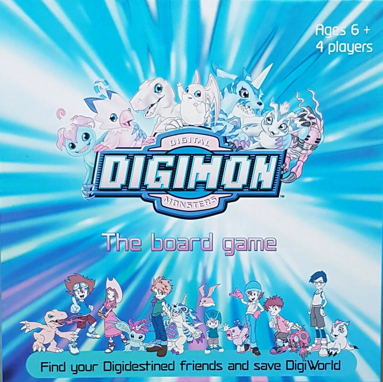 Digimon Board Game (Tagine: Find your Digidestined friends and save Digiworld) refers to the name of a piece of Digimon Merchandise, which is a board game that is based around the Digimon Adventure anime and its characters. The board game was released around the early 2000s and has a rating of aged 6+ and can be played by 4 players.