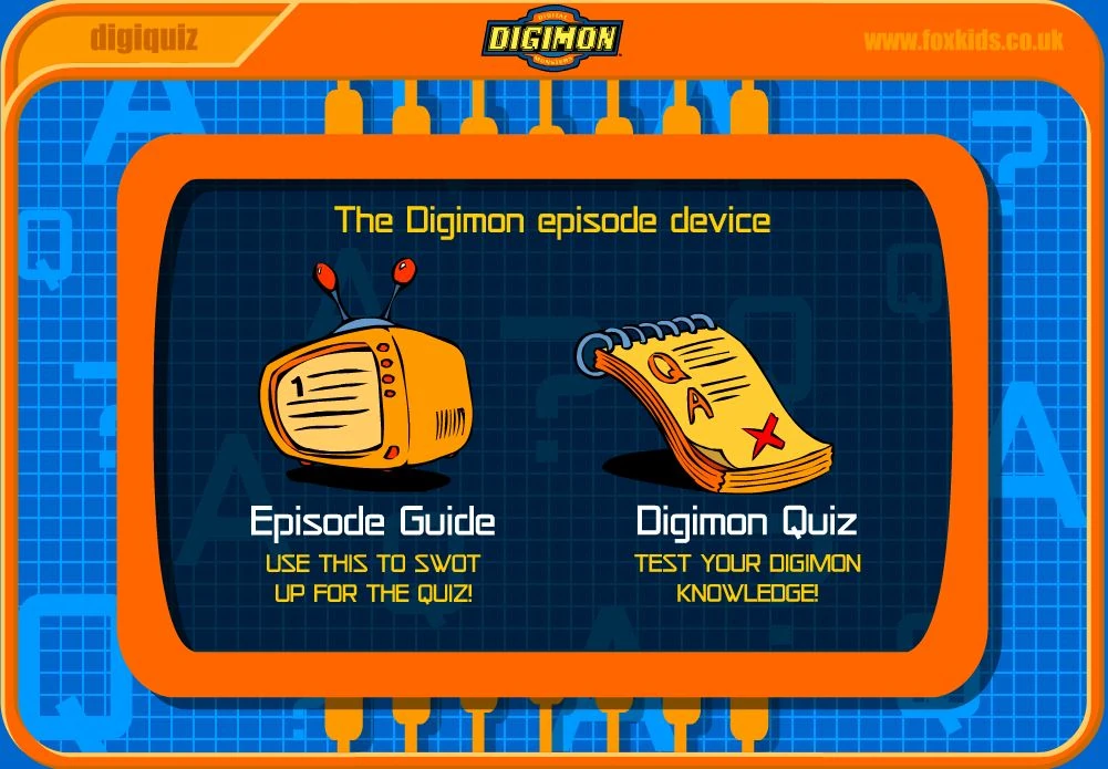 Digiquiz was an online Digimon Flash game hosted on the FoxKids website in the early 2000s. The game consists of a quiz based on the Digimon Adventure anime.