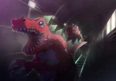 Three Tyrannomon chase their prey, a ModokiBetamon, around the subway. Just as they were about to trap their prey in a corner, a subway train drives passed with the Tyrannomon having to get out of the way to avoid being run over. They continue to chase their prey, with it running into the nearby sewers. As they look for their prey, one of them is suddenly killed by a surprise attack from the ModokiBetamon.