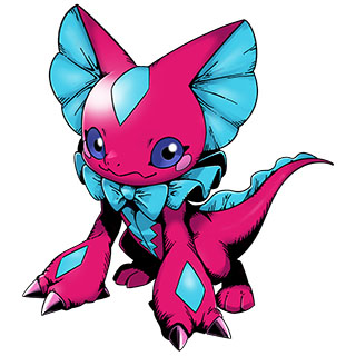 Elizamon is a Reptile Digimon. Its characteristic lapels are as delicate as fabric. Thanks to its exceptionally sensitive, ribbon-like ears, Elizamon can detect and react to even the most minor sounds in its surroundings. Usually preferring to dwell in quiet areas, it folds its ears to shut out noise when sleeping. An elegant Digimon, Elizamon's ears and collar lend it a cutesy appearance. There is another side to it, however, as Elizamon will expand its collar and pounce on foes when threatened.[2]