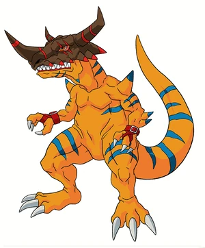 GeoGreymon is Agumon's Champion level form. GeoGreymon is a Dinosaur Digimon whose name and design are derived from "GeoGreymon. It is a unique Digimon that is conjectured to be a subspecies of Greymon. Its body and the carapace on its head have also developed like a full-length lethal weapon, and its appearance has become more aggressive.