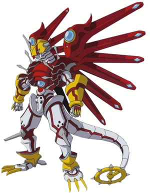 He beats similarities to the other Greymon Ulimate form, MetalGreymon, but his metallic parts are more sofisticated and high-tech in appearance. Replacing the brown helmet on his head is a metal one, making his eye appear more menacing. Red machinery is incoperaed into his chest, with a blue sphere in the center. "Wings" on his back fire off energy to help him fly. His left arm has been replaced with a large revolver. He has also lost the wristband on his other hand.