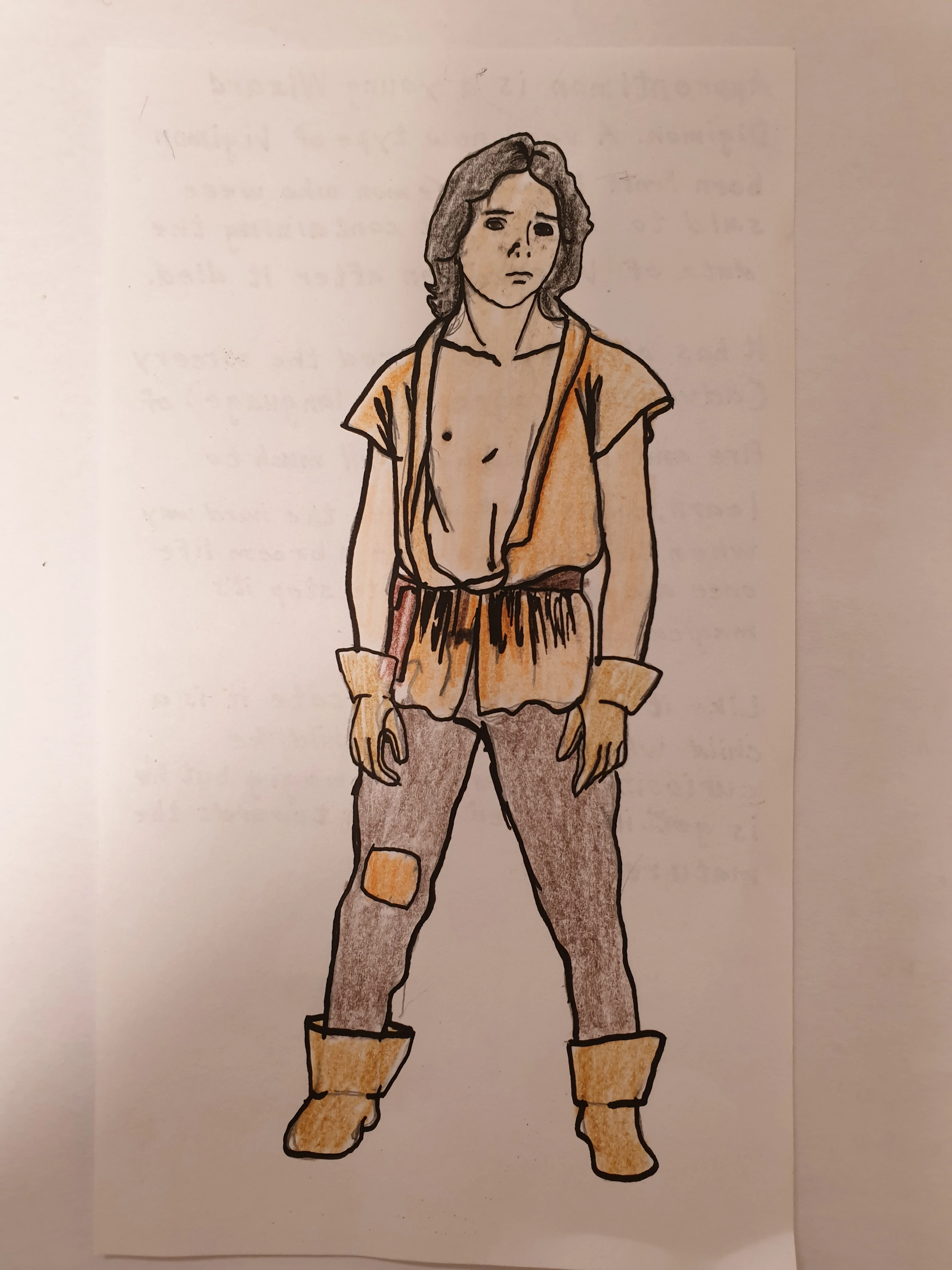 Apprentimon is a childlike humanoid. Unlike most humanoids it does not conceal its human-like face so its onix-black eyes and black hair can be seen. The Digimon wears an open short-sleeved shirt held closed with a belt around its waist that has a leather pouch attached to it, dark brown pants with a patch on the right knee. It wears brown shoes and matching brown gloves.