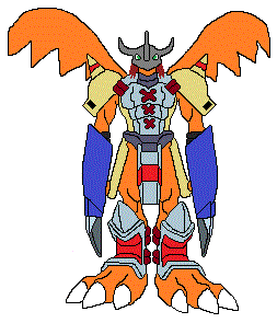 RelicGreymon is the first Mega form of PrimitiveAgumon. He bears a strong resemblance to WarGreymon with a few differences. He has two large orange wings on his back that enable flight. In his left hand, he wields the mighty relic known as the Dramon Destroyer Sword, an ancient sword crafted by Vulcanusmon and designed as the prototype for WarGreymon's own Dramon Destroyers. It is made of Chrome Digizoid and has Dramon Destroyers attached at the end. Any member of the Greymon-species may wield this sword and will digivolve into RelicGreymon shortly after picking it up, but in the hands of any other digimon, it will do nothing. In RelicGreymon's right hand is the Determined Shield, shaped in the outline of the Crest of Determination. RelicGreymon can change the Dramon Destroyer Sword and Determined Shield into a blue version of the Dramon Destroyers at will.