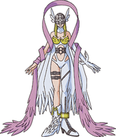 Angewomon is Gatomon's natural Ultimate form. Angewomon debuted during the final battle against Myotismon in Digimon Adventure. The sacrifice of Wizardmon and Kari's mourning activated the Crest of Light, allowing Gatomon to Digivolve into Angewomon. She then used her "Heaven's Charm" and "Celestial Arrow" to defeat him. Angewomon also gains a bow where she and Angemon shoot a single arrow on both Tai and Matt to attain both of their partner Digimon in Mega forms via Warp Digivolve. Angewomon was also a powerful ally in the fight against VenomMyotismon, the Dark Masters and Apocalymon. She also got into a cat fight with her rival LadyDevimon.