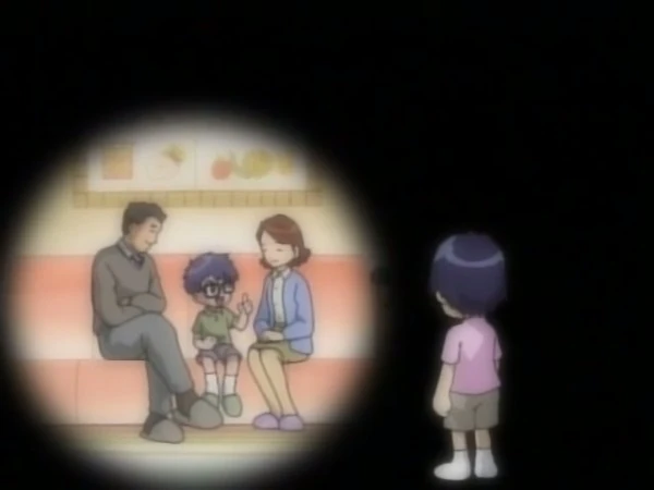 At the Ichijouji residence, Mr. and Mrs. Ichijouji are outside Ken's bedroom, seeing that he is still sleeping. In bed, Ken feels like he has lost his heart. Numerous memories of his past come to mind as he sleeps; the first one is of his brother Sam first teaching him how to blow bubbles, and admiring him for being such a genius. Then he recounts walking with his mother, seeing the neighbors tell her about Sam being a good smart boy and having so many abilities. Then at home, her mother tells Sam the exact same thing that they told her. Ken begins to feel jealous and ignored, and gets the idea that he'd never be noticed as long as Sam was around, and wishes for him to disappear.