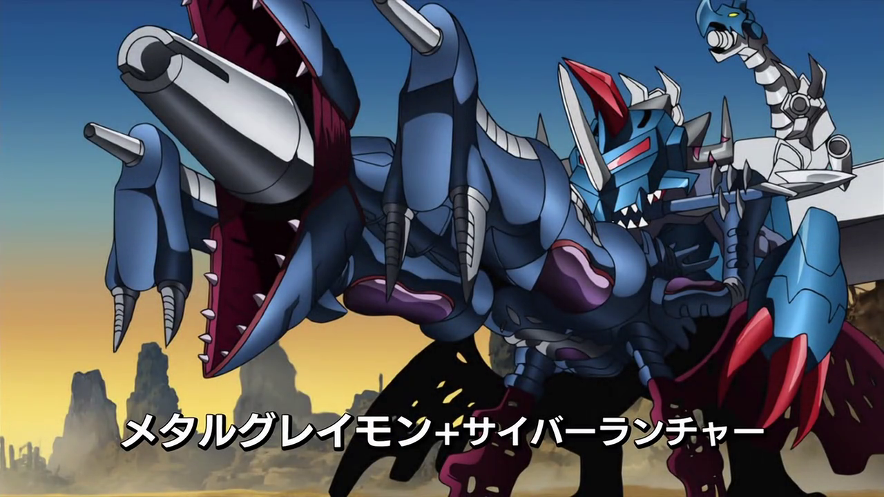 MetalGreymon Cyberdramon first appears when Blue Flare and the Fusion Fighters team-battle against Midnight and the Bagra Army in Dust Zone. He destroys all the remaining Tankmon and then aids in repelling SuperDarkKnightmon's parting strike. Disaster in the Dust Zone!
