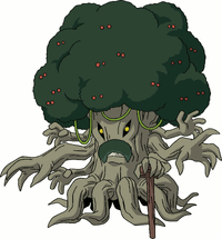 Cherrymon is a wise tree-like Ultimate level Digimon that tells stories about the Digital World. He first appeared when Marcus and the others battled Keenan and his partner, Peckmon. Cherrymon stopped the fighting because he didn't like violence. Then, Gotsumon summoned raining rocks on Cherrymon, and Gaogamon and Sunflowmon destroyed the falling rocks. And RizeGreymon destroyed a gigantic falling rock. Later, the DATS returned to Cherrymon's place, where they found some injured Digimon. Cherrymon told the story about the disaster in the Digital World, even about Merukimon's tragic demise. Marcus told Cherrymon that it was Kurata and his army of Gizumons who committed the massacre in the Digital World. When the Bio-Hybrids arrived, Marcus and the others tried to defend Cherrymon, but the Bio-Hybrids were too strong. They almost destroyed Cherrymon, but the DATS's partner Digimon used the last of their strength to defeat the Bio-Hybrids, forcing them to retreat. Then Cherrymon and the injured Digimon were safe once again.