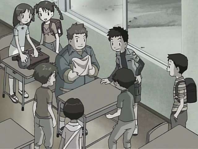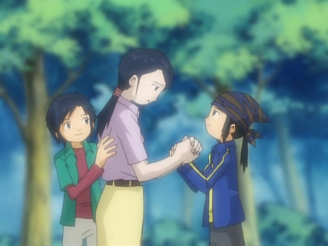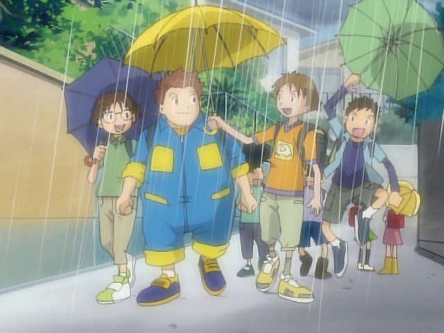 After J.P. returns from the Digital World, Kenta and the other two boys who once ignored J.P.'s request for help, offer to share their umbrellas with him in a rainy day. End of the Line