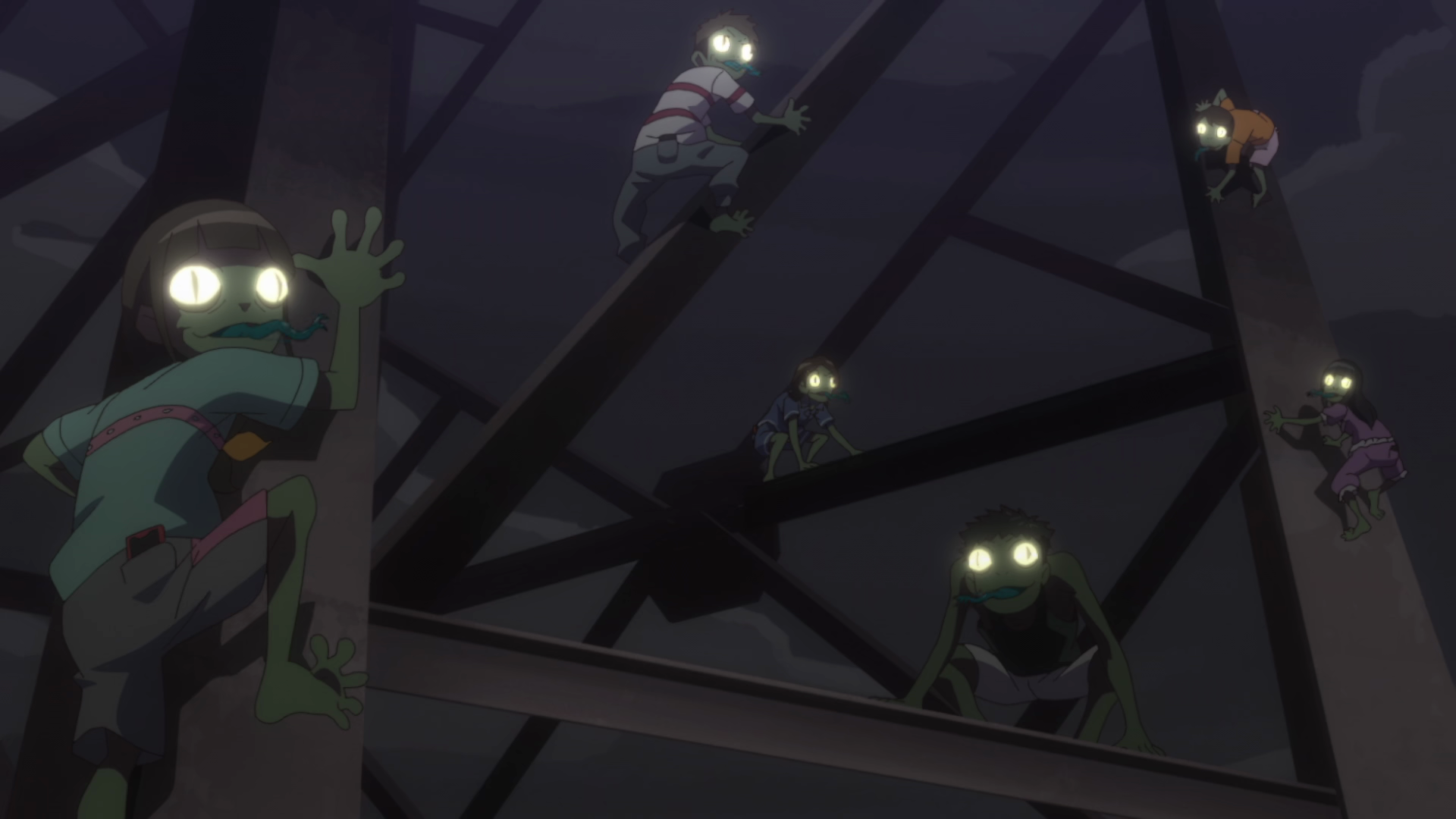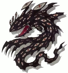 Eyesmon is a shadowy dragon parasite with thousands of red eyes that attacked and took control of an American girl named Emma Hanes in a restroom. There are also other victims, including a policeman, a celebrity stalking influencer, and a hikikomori. People that he takes control of will suffer from a condition where their eyes become red and red eyes grow all over their body, which are impossible to remove manually as Eyesmon actively prevents the host from doing so. Eyesmon also modifies his victim's behavior so they will help him gather data, making them abnormally touchy and willing to extract information from others (although when he was acting through Emma, Hiro and Kiyoshiro does not notice her behaving erratically at all). If left unchecked for a certain amount of time, the whites on the victim's eyes will turn red, their skin will peel off, and they will die through their body disintegrating.