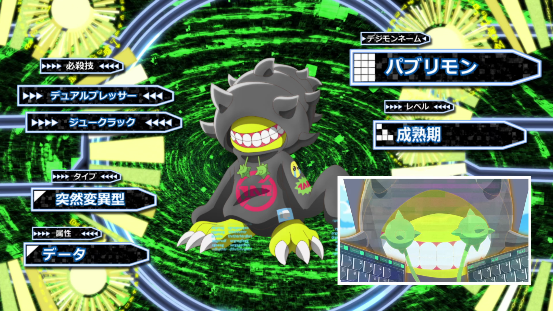 Publimon is a mutant Digimon wearing a seashell hood. He runs the "news site" PubliNews that initially consists of only articles of harmless pranks. However, it quickly escalated into articles depicting life-threatening incidents against specific people that happen on the next day. The notifications are impossible to delete and every incident reported on PubliNews will seemingly come into fruition. In reality, the articles do not actually depict future events and are harmless on their own, but Publimon will attempt to attack or kill anyone who says his incoherent reads are boring. He is aware of individuals reading his articles and can injure or kill his targets through creating independent, yellow limbs from anywhere, often by throwing objects at them or directly goading them to lethal incidents. The only warning before his attacks is an ominous visual glitch on his target's phones, followed by the screen switching to the PubliNews site. Since Publimon attacks his targets personally, this can be stopped if something like another Digimon halts the attack midway.