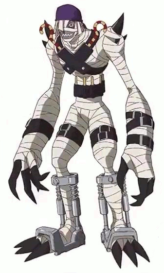 After arriving on the Human World, Mummymon learned of ancient Egyptian beliefs about mummification and mistook them as human medicine. Making the New National Ueno General Museum his home, Mummymon abducts any human he sees sighing and with a tired expression to be mummified, believing he was helping them to resurrect and achieve eternal life, and hiding them on a restricted area of the museum. This eventually leads to urban legends about a glitchy mummy walking around Ueno, which make into the October issue of Monthly Ghost and to comments by Lirurun followers. On October 9, when Ruli Tsukiyono, Mika Kashiwagi, and Aoi Udagawa go to the museum investigate, Aoi sighs after the other two leave, catching Mummymon's attention. Aoi almost notices Mummymon observing her. The same night he abducts Megumi Asakura when she is considering leaving her job. The following night Hiro Amanokawa and Gammamon meet Mummymon at the museum. Hiro asks Mummymon if he knows his father Hokuto or how to go to the Digital World, but his negative reply to both cause Hiro to sigh. Mummymon mistakes this as a sign he needs medical help and abducts Hiro and also traps the healthy Gammamon to prevent interference. Gammamon fights Mummymon and Hiro realizes his true intentions but is ignored when he tries to clear up the misunderstanding. He once again tries to mummify Hiro, but Gammamon digivolves to BetelGammamon and is able to match his power. Hiro finally manages to explain to Mummymon what mummies actually are, and Mummymon after realizing he could have caused people to die. He releases the patients, and Hiro and Gammamon take him to a place full of famous hospitals, encouraging to learn human medicine. The Mystery of the Museum