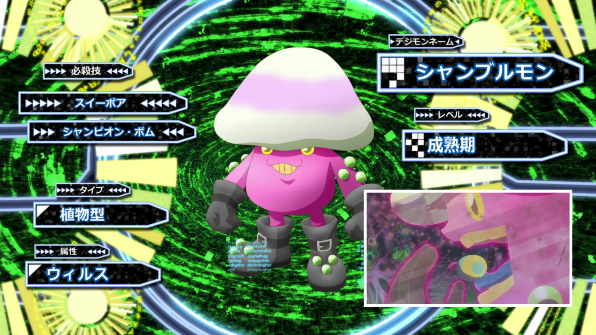 Chamblemon are Digimon who can create spores that grow on other living beings. Anyone hit by these spores are gravely weakened and become unable to fight back, at which they gleefully harvest the mushrooms grown on their bodies for food. They are vicious Digimon who enjoy the suffering of their victims and brutalizing them. There are a total of four encountered.