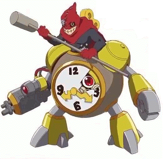 On October of Hiro Amanokawa's first year at Hazakura Private Academy, Clockmon attacks a Hazakura student in the school's auditorium. After the girl is hospitalized the news viralizes, reaching Mika Kashiwagi and Ruli Tsukiyono, the latter deciding to look for him. The next day, Hiro and Kotaro Nomura enter the auditorium to look for the Sewn-lip Man, following Ruli's social media post asking for info. Kotaro excitedly takes pictures, ignoring Clockmon's question, and he annoyedly attacks the boy. When he is about to attack Hiro, Aida-sensei and the Math Teacher enter the auditorium to investigate the boys' break-in, causing Clockmon to hide. He disappointedly watches the teachers escort Hiro away. Clockmon later tries to attack Hiro in his room at the Hazakura Boys' Dormitory, but Gammamon protects the boy, and the two fight until reaching a park. Clockmon tries to steal Gammamon's time, causing GulusGammamon's aura to briefly appear. Hiro figures out how to turn Clockmon's power against him and throws a chestnut branch, which grows into a tree, in an attempt to attack the Digimon, who dodges it. Gammamon's "Breaclaw" attack injures Clockmon, causing all the stolen time to return to its owners, restoring them to their regular ages. Clockmon runs away, vowing to steal Hiro's time at another opportunity. The Sewn-lip Man
