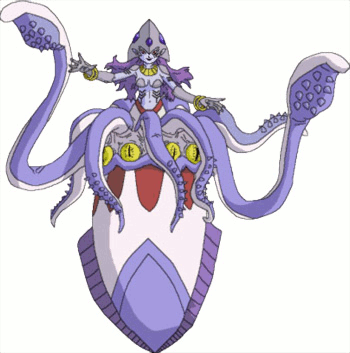 The night after the four arrive to the island, she uses her ripples to twist a sleeping Jellymon into a knob and started amplifying her ripples to the point that they can alter living beings like animals and even humans. When Hiro expands the Digital Field to prevent her from obtaining more victims, people and animals that she has affected remain within it. Hiro orders Jellymon to attack her with Bibi Thunder, but because she was twisted to a giant knob it did not work, and Espimon's Mot Bomb was deflected by her water tempests. Thankfully, Gammamon arrived to apologize to Hiro in time, and he Digivolves into Kaus Gammamon to avoid her water tempests, then fights her with Canoweissmon. After seeing the beauty of Canoweissmon's "straight" Dragonia and defeated, she willingly leaves at peace. Spiral Beach
