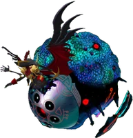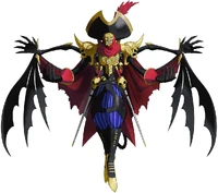 Boltboutamon is the fused form of Piedmon and Myotismon. When Kaito Shinonome leaves the group after Kenzoku are able to kill Miu Shinonome, said events cause him to go off on a blood thirsty path of revenge wanting to kill not just all Kemonogami but his now former friends as well — blaming them all for her death. When he screams in the forest about how he needs more power to be able to kill them all, Piedmon approaches him and asks him if he is serious about this. Kaito confirms he is serious, and agrees to team up with Piedmon — despite Dracmon begging him not to — stating that if Piedmon turns on him he'll just be the next one on his kill list. Piedmon, still wounded from his previous fights with the children, tells Kaito that even if he didnt kill him right now he would still die shortly anyway due to said wounds. Promising him the power to be able to achieve his new goal, he tells Kaito to have Dracmon evolve to Myotismon (meaning if Kaito hadn't reached 30 affinity and already had Dracmon evolve to Myotismon, then Dracmon instead gained Myotismon as an evolution during this murderous rampage) and tells him to have Myotismon fuse with him. Both Kaito and Dracmon doubt Piedmon, with Kaito not wanting to lose his partner and Dracmon thinking he was just tricking them since he will die if he doesn't fuse with him. Piedmon points out that by fusing, he would also lose his consciousness and simply wanted to fuse with him so that their new fusion could get revenge on Master. Feeling like he has no choice, Kaito forces Dracmon to perform the fusion and despite not wanting to Dracmon agrees to do it since he just wants to support his partner. As the fusion happens, Dracmon says goodbye and that he considered Kaito to be his brother, indicating that he considered this fusion to be his death. Dracmon warp evolves to Myotismon and then fuses with Piedmon to form Boltboutamon. Seconds after the fusion, the children run in — having found the footprints of the trio allowing them to find where Kaito was. He tells them what happened, with the others shocked that he would not only team up with Piedmon but sacrifice Dracmon to create Boltboutamon. He tells them he will use Boltboutamon's power to destroy both the alternate world and human world in revenge for Miu's death. He tells Boltboutamon to kill everyone, starting with the children and then Miyuki Minase, and then Master. The children point out that if he kills Miyuki then he won't be able to get home, though he doesn't care since both worlds will be destroyed anyway and has Boltboutamon attack his former allies. The children are no match for Boltboutamon, with Kaito laughing at how weak they are. Takuma tries to talk him down, telling him that this isn't what Miu would want only for Kaito to state that as her brother he knows what she wants. He assumes that Takuma was in love with her, which is why he was claiming to know her better than him, which angers him, since that just made him the same as the stalker Kaito had previously nearly killed in the past. Deciding to do the same to Takuma, he attacks Takuma with his own fists. As he beats up Takuma, he suddenly notices Master was watching the fight, which causes both him and Boltboutamon to chase after it — sparing the kids for now. They chase after Master all the way to its hideout, the bottom floor of the shrine. Master summons many Kenzoku in an attempt to save itself but they are all slain by Boltboutamon. Kaito uses Boltbooutmon's power to remove Master from Miyuki, having changed his mind about killing her, though since he still wanted revenge against her so beat her up until she was unconscious. Despite this slight act of mercy, he still plans to end both worlds since he considers them pointless without Miu. He sends Boltboutamon to try and kill them again, though this time they are able to defeat him. After the battle, Aoi tells him to honor Miu's memory by protecting Jijimon and the others as that was what she was trying to do when she died. Kaito realizes that she was right and that had he destroyed both worlds, Jijimon and the others would've died which is something Miu didn't want to happen. The others invite him back to the group despite everything he had done, though after he accepts and returns to the group, Boltboutamon turns on Kaito and kidnaps Miyuki. As it was wanting to destroy the world that caused Boltboutamon's existence to happen, no longer desiring this caused Kaito's bond to Boltboutamon to end — which allowed Piedmon's mind to take over the fusion (as Dracmon's was the one controlling it until that very moment). Desiring to access Miyuki's power to open gates to the human world, Boltboutamon begins to absorb her to do so though the Professor and Kaito charge in and attack him in an attempt to stall him and allow Miyuki to escape. This fails though, as Boltboutamon simply absorbs all three of them, killing them all. This also causes Renamon and Garurumon to die as well, as they were the destined partners of Miyuki and the Professor. Now with the power to travel to the human world, Boltboutamon leaves planning to first kill Master and then go to the human world to destroy it. He travels to Master's domain and attacks him, but ends up being defeated. The children arrive just as Boltboutamon loses, and see Master absorb Boltboutamon within himself which then gives Master the power to travel to the human world instead. This ended up being Master's final mistake however, as Boltboutamon absorbs Master from the inside and forces a fusion between them with this leading to the creation of Boltboutamon (Fusion). Boltboutamon (Fusion) now had even more power as he gained the power of every single being sacrificed to Master (including their deceased friends) which also allowed him to hear their thoughts. Using Miyuki's power, he opens a gate to the human world and tells them to go through it since they can at least enjoy being in the human world for a short while b