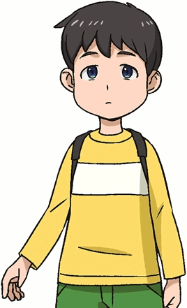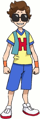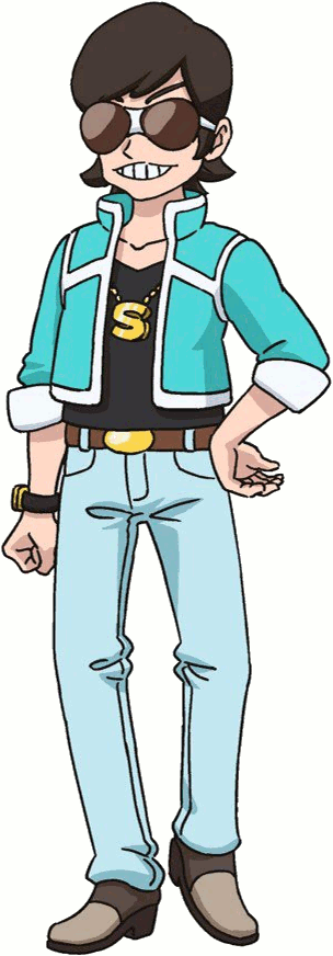 Hikatarou is a young man with black hair. He wears brown sunglasses, a black shirt, a golden "S"-shaped pendant, a blue and white jacket with rolled-up sleeves, a golden and black wristwatch, a brown belt with a golden buckle, light blue jeans, and brown shoes. His design is based on SEIKIN.