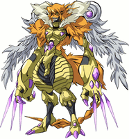Raguelmon is Meicoomon's corrupted Mega form. Meicrackmon digivolves into this form in response to her fear induced anger of being attacked by Jesmon. The Digidestined and their Digimon partners try to find a way to save her from the madness, leading only Omnimon being the one that can stand up to her. Jesmon's special attack causes her to fall into unconciousness. She eventually awakens by the newly digivolved Ophanimon: Falldown Mode's power, and fused with her to become Ordinemon.