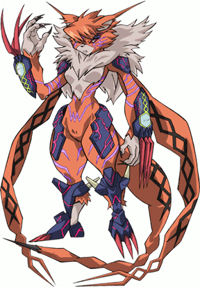 Raguelmon is Meicoomon's corrupted Mega form. Meicrackmon digivolves into this form in response to her fear induced anger of being attacked by Jesmon. The Digidestined and their Digimon partners try to find a way to save her from the madness, leading only Omnimon being the one that can stand up to her. Jesmon's special attack causes her to fall into unconciousness. She eventually awakens by the newly digivolved Ophanimon: Falldown Mode's power, and fused with her to become Ordinemon.